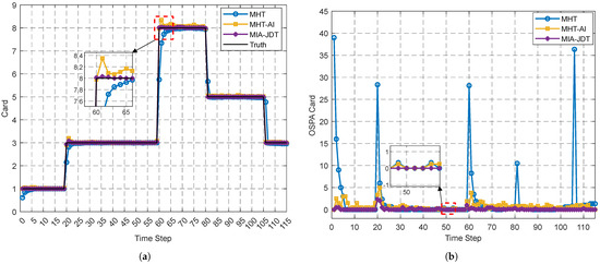 Figure 6a,b show the card estimation and OSPA Card of standard MHT, MHT with amplitude information aided, and the proposed algorithm (MIA-JDT) with a clutter density of λ c ˜ = 10 6 . It can be observed that the standard MHT algorithm has the poorest cardinality estimation accuracy, especially when the number of targets changes, while the MIA-JDT algorithm achieves the best overall cardinality estimation performance.