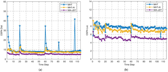 Figure 7. (a) The OSPA Dist among standard MHT, MHT with amplitude information aided (MHT-AI), the algorithm we proposed (MIA-JDT) and the ground truth. (b) OSPA Loc among three algorithms at each time step.
