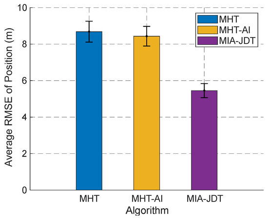 The performance of the three algorithms was compared using the average RMSE of position. As shown in Figure 8, a plot with error bars demonstrates significant differences among the algorithms. MHT yielded the highest average RMSE (8.68 ± 0.57 m), followed by average RMSE (8.43 ± 0.54 m) of MHT-AI, while MIA-JDT achieved the lowest average RMSE (5.45 ± 0.39 m). The smaller standard deviation of MIA-JDT compared to others suggests more consistent performance.