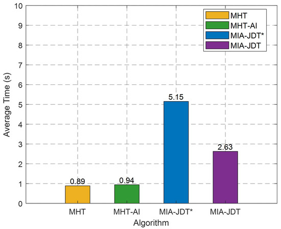 Since this paper modifies the model probability computation in the VS-IMM framework and implements probabilistic model switching, this subsection compares the computation time of standard MHT, MHT-AI, MIA-JDT with traditional VS-IMM (MIA-JDT*) and the MIA-JDT with improved VS-IMM (MIA-JDT). Except for the VS-IMM filter, the remaining components of the latter two algorithms are identical. The simulation scenario settings are the same as in Figure 5 and Table 1. The hardware configuration used for the experiments is an Intel(R) Core(TM) i7-7700K CPU @4.20GHz, and the software is MATLAB R2024a.