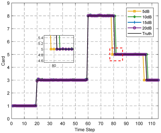 Since the proposed algorithm incorporates SCR information assistance, we conducted experiments to investigate the impact of SCR information on tracking performance. The experimental results of the card estimation, OSPA, and time per step will be presented in the form of a Figure 10 and a Table 3.
