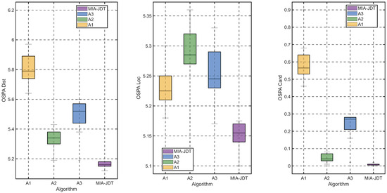 Figure 11. Box plots of the average OSPA Dist, OSPA Loc, and OSPA Card obtained from 10 groups of Monte Carlo ablation experiments, with 100 trials per group.