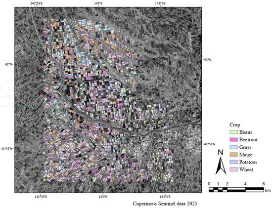 Information on the locations of agricultural fields was downloaded from https://open.fude.maff.go.jp/ and used in this study. The number of agricultural fields used for each crop was as follows: 533 for beans, 274 for beetroot, 720 for grass, 451 for maize, 188 for potatoes, and 496 for wheat. The field areas (in hectares) for each crop are summarized in Table 1. The reference data were created based on crops cultivated between June and August 2024, and no changes in the cultivated crops occurred during the period when the Sentinel-1 data were acquired.