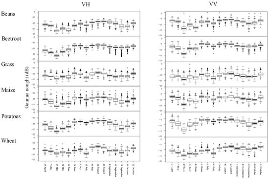 The time-series variations in backscatter coefficients for each crop are shown in Figure 3. The temporal dynamics of VH and VV polarization backscatter coefficients reflect both the scattering characteristics of C-band microwaves and the phenological stages of each crop. By 25 April, most fields had not yet been sown or transplanted, and the backscatter signals were primarily influenced by surface conditions, such as residual plant material from the previous growing season and high soil moisture from snowmelt. In contrast, perennial grasses and winter wheat, which had been cultivated since the previous year, showed backscatter mainly from small, emerging plant structures, with less contribution from the soil surface. As a result, the VH backscatter coefficients exhibited little variation among the six crop types, with average values ranging from −16 to −17 dB. However, the VV backscatter for perennial grasses and winter wheat was noticeably lower than for other crops. Following this initial period, both VV and VH backscatter for perennial grasses and winter wheat dropped significantly on 19 May, likely due to early growth stages with sparse canopy coverage, but then increased again by 31 May as the canopy developed. For beans, a distinct decrease in backscatter occurred on 12 June, possibly due to canopy closure, which reduces volume scattering. From then until 6 July, backscatter values generally increased as crop biomass grew. On 18 July, backscatter for perennial grasses and winter wheat declined sharply due to harvesting. For the remaining crops, backscatter continued to rise until around 23 August, reflecting ongoing growth and canopy development. After this peak, backscatter began to decrease as the crops entered their ripening stages and approached harvest. The rate and timing of this decline varied depending on each crop’s maturity and harvest schedule, with most fields showing a decrease in backscatter by 18 September.