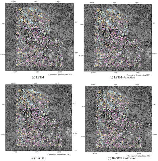 In classifying six crop types, the TCN outperformed both LSTM and Bi-GRU. This superior performance can be attributed to TCN’s ability to capture long-range temporal dependencies more effectively through its hierarchical, dilated convolutional structure. Unlike recurrent models, TCN processes all time steps simultaneously and avoids the vanishing gradient problem, which often limits the ability of RNN-based models such as LSTM and Bi-GRU to learn from long time-series data. Given the gradual and seasonal changes in crop development reflected in the SAR time series, TCN’s structure enabled it to model these patterns more efficiently and accurately. The addition of an attention mechanism improved classification accuracy for both LSTM and TCN. In LSTM, attention helped overcome the limitation of sequential memory by allowing the model to focus on important time points, particularly during key growth stages. For TCN, the attention mechanism further enhanced its ability to prioritize critical periods, sharpening its focus on informative features throughout the time series without losing its inherent parallel processing advantage. However, in the case of Bi-GRU, the addition of attention did not result in noticeable improvements. This could be because Bi-GRU already processes the sequence in both forward and backward directions, inherently capturing important temporal dependencies. Thus, the marginal benefit of adding an attention layer to Bi-GRU was limited. Furthermore, Bi-GRU may not have been as effective as TCN in handling long time sequences with subtle variations, meaning that attention alone was insufficient to compensate for its architectural limitations in this task. Overall, these results suggest that model architecture and feature extraction strategies must be carefully selected based on the nature of the temporal patterns in the data. Attention mechanisms are particularly beneficial for models that process sequences sequentially (e.g., LSTM) or in a convolutional manner (e.g., TCN), but not necessarily for bidirectional recurrent models such as Bi-GRU.