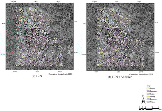 Several studies have utilized Sentinel-1 SAR data in combination with optical sensors for crop type classification, achieving overall accuracies ranging from 70% to 85%, depending on factors such as crop classes, study region, and modeling approaches. For example, Inglada et al. [54] used a random forest classifier to map major crops, reporting an OA of approximately 80%. Veloso et al. [55] applied time-series Sentinel-1 data for crop classification in southwestern France, achieving accuracies between 70% and 85%. In this study, an OA of 85.7% was achieved using a TCN with an attention model to classify six major crop types in the Tokachi Plain, Hokkaido. This result is comparable to, or slightly greater than, previous studies, despite the challenge of distinguishing between crops with similar growth patterns, such as beans and maize. Factors contributing to this strong performance include the dense temporal sampling of 16 Sentinel-1 scenes, the use of both VH and VV backscatter coefficients and the polarization ratio as input features, and the adoption of advanced deep learning models that effectively capture temporal dynamics.
