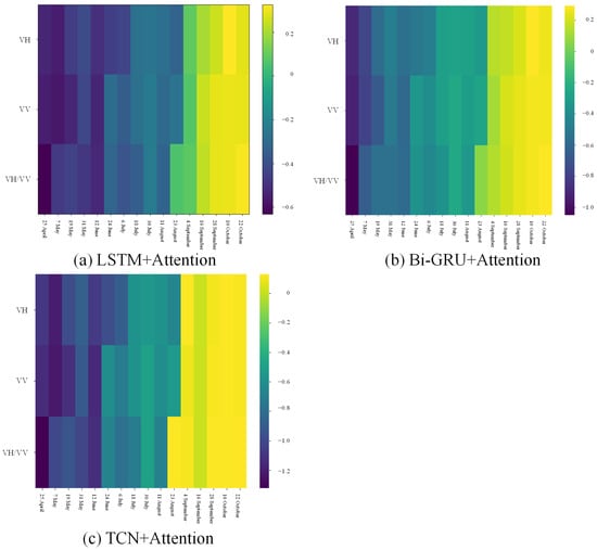 Among the three models, TCN uniquely placed higher importance on the polarization ratio on 23 August and the data from 4 September. This suggests that TCN may be more effective at capturing subtle temporal patterns in backscatter evolution, benefiting from its ability to model longer temporal dependencies compared to recurrent models such as LSTM and Bi-GRU. Overall, these findings emphasize the importance of selecting appropriate observation periods and features (e.g., polarization ratio) when designing SAR-based crop classification models, especially for operational monitoring applications.