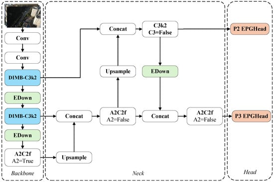 Overall architecture of ELNet. First, the backbone and neck are streamlined by removing one A2C2f module from each, effectively reducing redundancy. In addition, the size and number of detection heads are adjusted, and the EPGHead is introduced to lower computational complexity. The EDown module is then incorporated to optimize the downsampling process. Furthermore, the original C3k2 structure is substituted by DIMB-C3k2, enhancing the backbone’s feature representation capability. P2 and P3 represent detection heads with output resolutions of and , respectively.