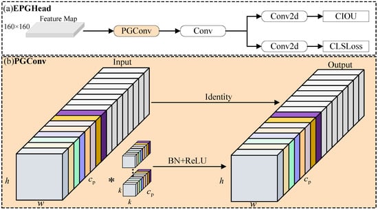 Architecture of EPGHead. (a) The detailed structure of the detection head, where the feature map corresponds to the P2 layer. The structure of the P3 detection head is similar. (b) The design of the partial group convolution (PGConv) operation, in which ∗ denotes the selected partial channels involved in the grouped convolution with the convolutional kernel. BN and ReLU represent batch normalization and the activation function, respectively. The matching colors in the input/output feature maps and the convolution kernel signify that the convolution is applied only to corresponding channel groups. This visualization demonstrates that a specific partition of the kernel operates exclusively on its corresponding partition of the input channels.