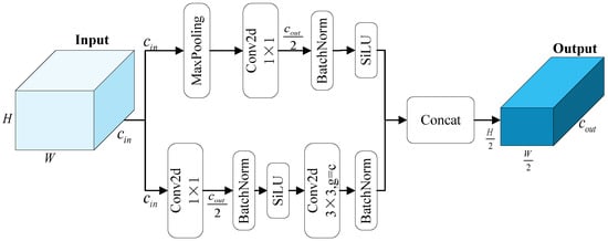 Given an input feature map , the EDown module employs a dual-branch design to extract features more efficiently. The first branch (upper path) primarily utilizes max pooling to downsample the input while retaining the dominant structural information. Its computational process is formulated as follows: