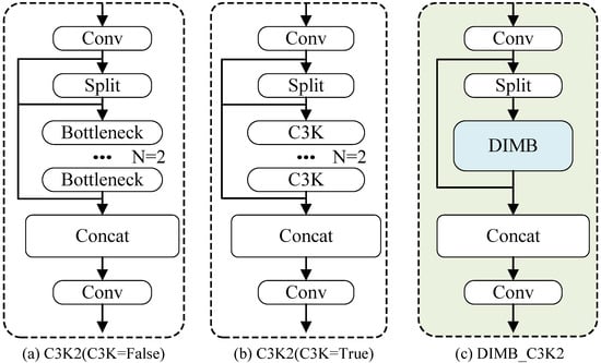A comparative analysis of the C3k2 and DIMB-C3k2 modules is presented. (a) The structure of the C3k2 module without the C3k block, and (b) the structure of the C3k2 module with the C3k block, where both the bottleneck and C3k blocks are primarily composed of stacked convolutional layers. (c) The detailed architecture of the proposed DIMB-C3k2 module.