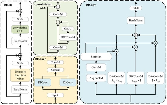 The DIMB module consists of three components: dynamic inception convolution (DIConv), dynamic inception mixer (DIMixer), and a residual cross-layer connection structure designed to enhance feature propagation. This design is inspired by the MetaFormer architecture [56], which emphasizes the importance of token mixing and residual pathways for efficient information flow.