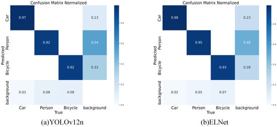 An analysis is conducted on the HIT-UAV dataset to visually compare the detection performance of YOLOv12n and the improved ELNet. The confusion matrices for both models are presented in Figure 10. As observed from the confusion matrices, ELNet exhibits a lower misclassification rate across all categories than YOLOv12n. Notably, significant improvements in classification accuracy are achieved for the person, car, and bicycle categories. These results suggest that ELNet exhibits improved object differentiation in complex scenes, confirming its effectiveness and robustness in UAV-based object detection.