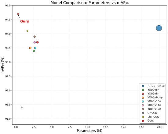 Model detection performance comparison scatter plot. The x-axis represents the model parameter size, while the y-axis denotes the mAP50 score. The size of each scatter point is proportional to the corresponding model’s FLOPs.
