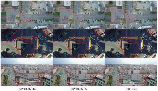 To provide a clearer illustration of the performance improvements achieved by ELNet, we conduct a comparative visualization analysis of the detection results from YOLOv11n, YOLOv12n, and ELNet. Specifically, we select images from the VisDrone2019 dataset, which feature varying perspectives, illumination conditions, and complex backgrounds. The results are displayed in Figure 12 for reference. The cyan bounding boxes indicate detected vehicles, and the purple bounding boxes represent detected motorcycles. We magnify key regions where discrepancies are observed to facilitate a more precise detection performance comparison across different models. The enlarged results show that, compared with YOLOv11n and YOLOv12n, ELNet demonstrates enhanced detection capabilities under varying angles, lighting conditions, and complex backgrounds, with a notable improvement in minimizing missed detections. This further validates ELNet’s superiority in small-object detection within complex environments, providing an effective real-time UAV-based object detection solution.