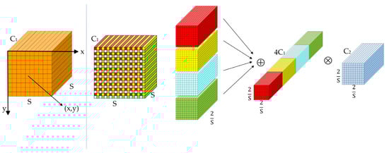 Each sub-feature map is obtained by downsampling through the extraction of pixels at intervals specified by the scaling factor, with the dimensions of each being (, , ). Subsequently, these sub-feature maps are concatenated along the channel dimension to generate a new feature map , as follows: