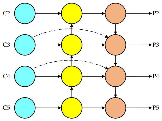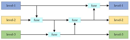Figure 4 illustrates the feature fusion mechanism in the conventional Feature Pyramid Network (FPN) architecture, where features are hierarchically organized across three levels—level-1, level-2, and level-3. While the FPN framework is designed to enable multi-scale feature integration, its structural limitations restrict direct information exchange to adjacent levels, necessitating an indirect propagation pathway for non-adjacent levels.