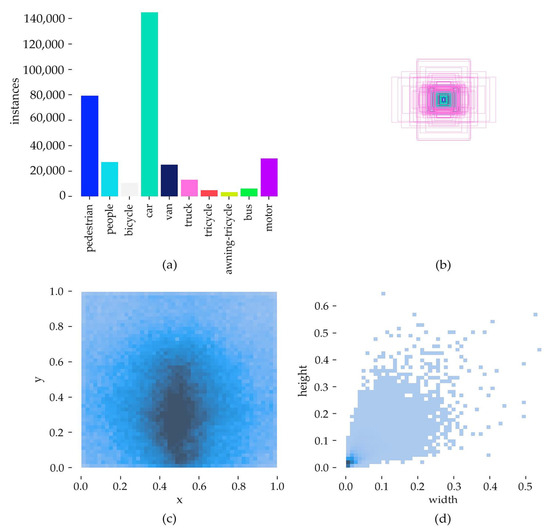 Visualization of training dataset. (a) Category distribution. (b) Distribution of label frame length and width. (c) Spatial distribution of object centers. (d) Distribution of object width and height.
