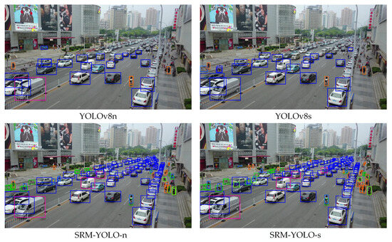 Overall, SRM-YOLO exhibits greater sensitivity and robustness, effectively detecting a higher number of objects, particularly small and distant vehicles and pedestrians. This improvement is evident in the increased number of bounding boxes in the images, underscoring the model’s enhanced performance in dense traffic environments. These results suggest that SRM-YOLO is better suited for accurately detecting small objects in complex scenes.