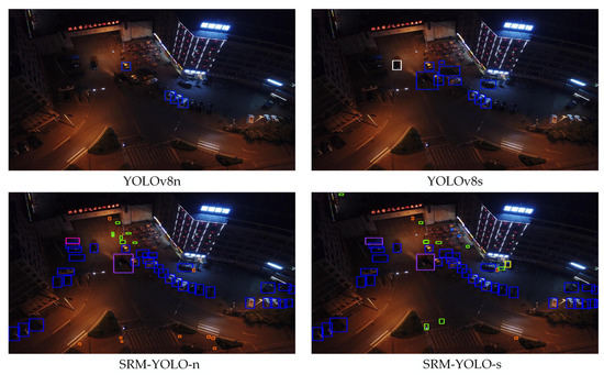 Figure 10 illustrates a surveillance scenario in which a UAV captures a top-down nighttime view of a residential community entrance. Due to insufficient illumination, large portions of the image exhibit extremely low brightness, significantly hindering object localization and classification. This poses substantial challenges for detection algorithms operating in low-light conditions. The experimental results indicate that YOLOv8n and YOLOv8s not only struggle to detect objects in severely underexposed areas but also suffer from false detections and missed detections. In contrast, the proposed SRM-YOLO model successfully detects some objects under these challenging conditions, demonstrating improved robustness and practical applicability for object detection in dark environments.