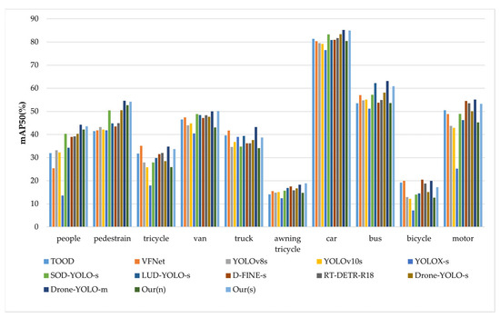 To comprehensively evaluate the performance of SRM-YOLO, we compared it against a broad spectrum of state-of-the-art object detection models. The benchmark set includes anchor-free detectors such as TOOD [48], VFNet [49], various YOLO-based architectures, and several enhanced variants, including SOD-YOLO [50], LUD-YOLO [51], and a customized version named Drone-YOLO. Additionally, transformer-based detectors—such as RT-DETR-R18 [52] and D-FINE-S [53]—were incorporated to ensure a thorough and balanced assessment.