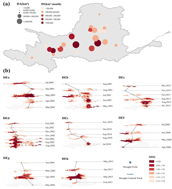 Spatial distribution of the center of mass of drought events in the Yellow River Basin from 2000 to 2020 (a) and spatial migration paths of the center of mass of eight typical drought events (b).