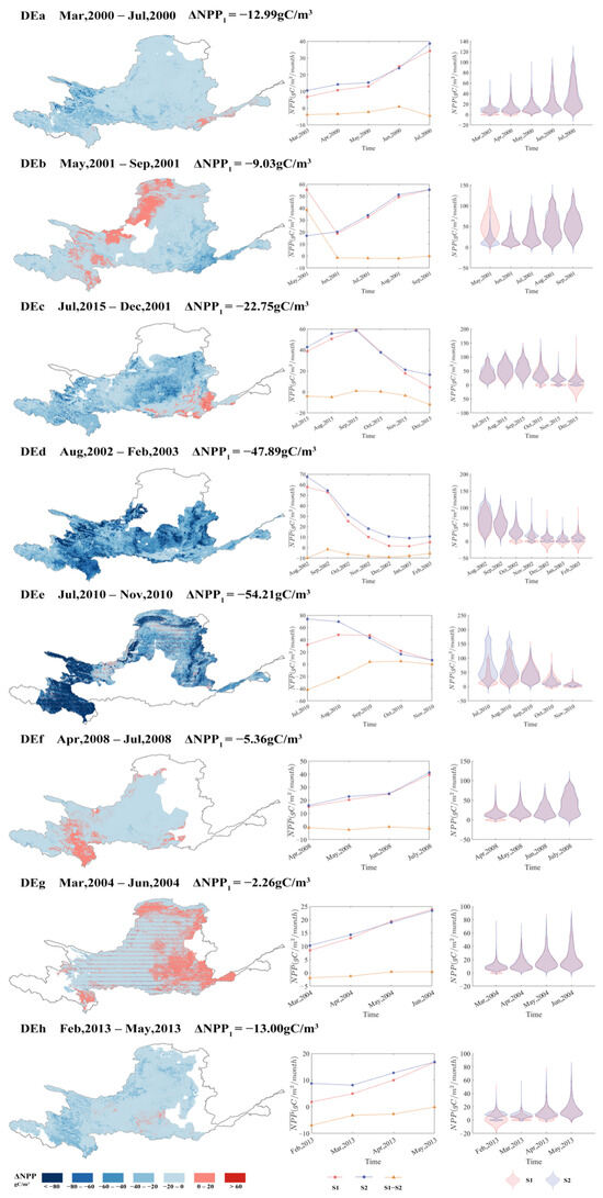 During most drought events, the absolute value of ΔNPP2 exhibited a certain degree of attenuation characteristics. During the DEe, the first month’s ΔNPP2 reached −40.21 gC·m−2, while it attenuated to 1.40 gC·m−2 at the end. This nonlinear attenuation process suggested that there may be some physiological regulatory mechanisms within the ecosystem to mitigate the negative effects of resource competition.