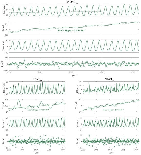 A multi-scale analytical framework was employed to investigate vegetation dynamics drivers. Spatiotemporal NDVI trends were rigorously assessed through the integrated application of Sen’s slope estimator for magnitude quantification and the Mann–Kendall test for statistical significance evaluation [46,47]. Additionally, the NDVI time series is decomposed into trend (), seasonal (), and residual () components using the Seasonal-Trend decomposition procedure based on Loess (STL)—a robust method for intuitive exploration of time-series data. This technique, successfully applied in visual analytics for temporal pattern identification, event detection, and trend forecasting, effectively separate the vegetation dynamic characteristics at different temporal scales [48,49].