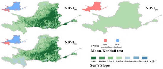 STL decomposition revealed a significant NDVI increase in the Yellow River Basin from 2000 to 2020 (Sen’s slope = 3.45 × 10−4, p < 0.01), with a five-year moving average 24% higher than the 2000–2004 baseline. The trend analysis revealed that human activities () dominated vegetation variability (), contributing 78% of the observed change (slope = 2.87 × 10−4), while climate factors () accounted for only 22% (slope = 0.79 × 10−4). This confirms that vegetation greening in the basin was primarily driven by afforestation efforts, with climate warming and humidification playing a secondary role (Figure 4). Spatially, the increase in NDVI showed significant heterogeneity. The Loess Plateau hinterland formed a core area of vegetation restoration (Sen’s Slope > 6.0 × 10−4, p < 0.05), which highly overlapped with the implementation area of the Middle Reaches of the Yellow River Shelter Forest Project (SPMRYR), showing a significant spatial coupling effect. The amplitude in the TNSP and APTM areas was 0.0–6.0 × 10−4 (p < 0.05), while local degradation occurred in human activity-intensive areas such as the Guanzhong Plain, Hetao Plain, and the ecologically vulnerable areas at the northeastern edge of the Tibetan Plateau (Sen’s Slope was a negative value) (Figure 5).