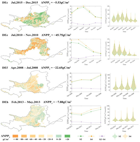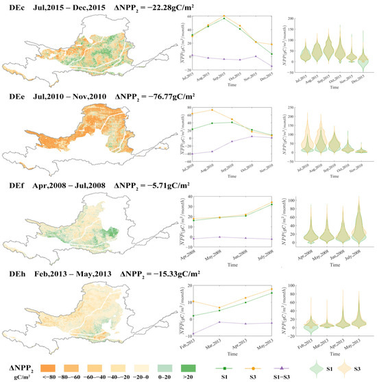 Drought events significantly exacerbated the suppressive effect of NDVI growth on NPP (Figure 9). Relative to ideal climate conditions, the negative ΔNPP2-ΔNPP3 values observed during four representative drought events revealed that drought stress intensified NPP suppression by 155.5% on average. Event DEe had the most significant amplification, during which ΔNPP2 reached −81.58 gC·m−2. There was an increase in inhibition intensity of 78.3% compared to ΔNPP3 (−45.75 gC·m−2) (ΔNPP2-ΔNPP3 = −31.00 gC·m−2). Although the absolute values of ΔNPP2-ΔNPP3 for events DEc and DEh were lower (−16.76 and −7.45 gC·m−2), their relative amplification rates are as high as 303.1% and 94.5%, which reflected the impact of short-duration droughts on vegetation physiological processes.