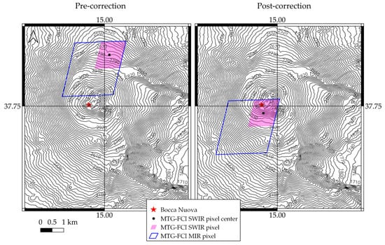 | Latitude of the SWIR pixel to be corrected [deg] | 37.775024 | Corrected latitude of the SWIR pixel [deg] | 37.74654 |