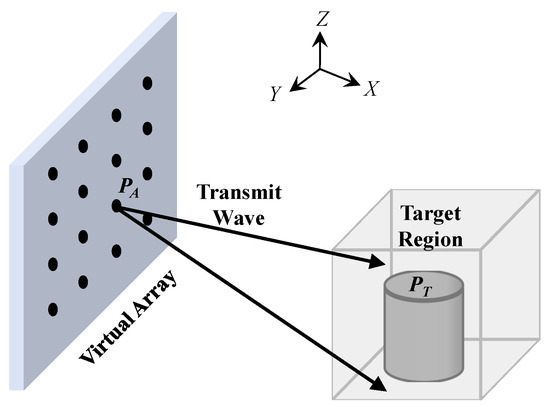A geometric schematic of the array SAR reconstruction is shown in Figure 1. The SAR system uses servo motors to control the radar platform to perform linear motion to achieve the synthesis of two-dimensional (2D) virtual arrays. The radar system transmits a linear frequency-modulated (LFM) signal to illuminate the target, while the receiving antenna captures the corresponding echo. Due to the propagation path between the radar element and the target scattering point , the received echo exhibits a time delay relative to the transmitted signal. The expression for the echo signal is [40,41]