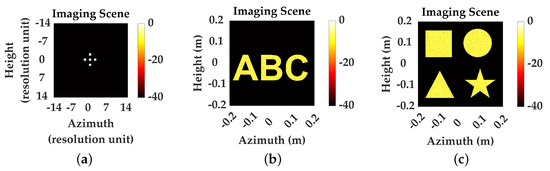 Target scene. (a) Point target. (b) Alphabet targets. (c) Complex geometric targets.
