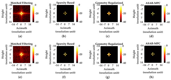 The 2DMP of point targets at different SNR. (a–d) MF, SP, GEO, and ASAR-MPC at 10 dB SNR. (e–h) MF, SP, GEO, and ASAR-MPC at 0 dB SNR.