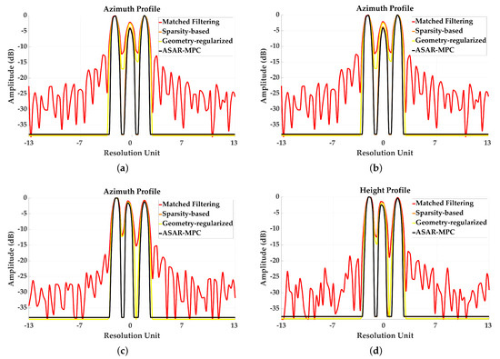 Furthermore, we compare the resolution of point targets using different methods. The resolutions of various methods in the azimuth and height directions are shown in Figure 4. The visualization results indicate that the proposed method has higher resolution. The resolutions of the reconstruction methods under different SNR are listed in Table 1. At a 10 dB SNR, the azimuth resolution (AR) and height resolution (HR) of the proposed method are 0.195 cm and 0.215 cm, respectively. At a 0 dB SNR, the AR and HR of the proposed method are 0.225 cm and 0.225 cm, respectively.