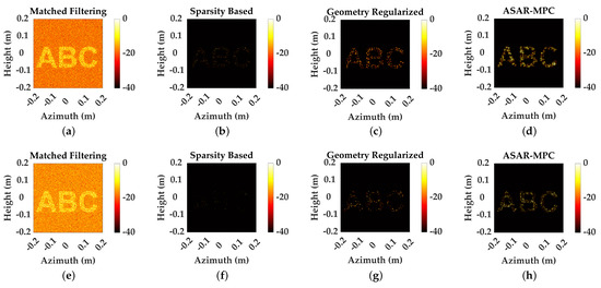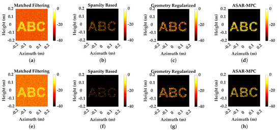 The 2DMP of alphabet targets at 50% SR. (a–d) MF, SP, GEO, and ASAR-MPC at 10 dB SNR. (e–h) MF, SP, GEO, and ASAR-MPC at 0 dB SNR.