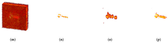 The result of the multiple complex targets. (a–d) The 2DMP of MF, SP, GEO, and ASAR-MPC under 50% sampling. (e–h) The 3D results of MF, SP, GEO, and ASAR-MPC under 50% sampling. (i–l) The 2DMP of MF, SP, GEO, and ASAR-MPC under 25% sampling. (m–p) The 3D results of MF, SP, GEO, and ASAR-MPC under 25% sampling.