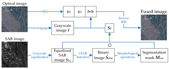 By addressing the limitations in existing methods and fulfilling these two demands, the fusion of SAR and optical images can be optimized for UAV visual navigation applications. This emphasizes the importance of a targeted fusion strategy that aligns with the specific requirements of UAV visual navigation tasks. Hence, this paper proposes an SAR Target-Augmented Fusion (STAF) algorithm that integrates SAR image object detection with optical data processing, where the STAF algorithm encompasses three primary steps: constant false alarm rate (CFAR) detection, morphological operations, and intensity–hue–saturation (IHS) transform. By leveraging the complementary strengths of both optical and SAR images, the proposed method significantly enhances environmental perception capabilities with microwave vision.