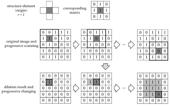 where is the dilation result; indicates the dilation operation. When the origin of is translated to the pixel location of , if the intersection () of and is not the null set (), then the corresponding pixel location of the output image is assigned the value of 1; otherwise, the value is assigned to 0, as depicted in Figure 3.
