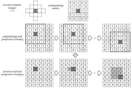 where is the erosion result; indicates the erosion operation. When the origin of is translated to the pixel location of , if is completely contained () in , then the corresponding pixel location of the output image is assigned the value of 1; otherwise, the value is assigned to 0, as depicted in Figure 4.