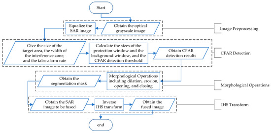 The STAF algorithm encompasses four primary steps: image preprocessing, CFAR detection, morphological operations, and IHS transform. Here is a detailed breakdown of each step.