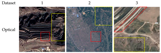 The effectiveness of the microwave vision-enhanced environment perception method proposed in this paper, as well as the superiority of the STAF algorithm, is validated by designing comparative experiments on three datasets: Dataset 1: High-resolution SAR and optical dataset named YYX-OPT-SAR [56]. Dataset 2: Medium-resolution SAR and optical dataset named WHU-OPT-SAR [57]. Dataset 3: Collection of optical and SAR images obtained from UAV aerial photography in an outdoor scene. The experiments were conducted on a computer with an Intel Core i5-12500H CPU and an Intel Iris Xe graphics card. Additionally, this paper aims to facilitate a more thorough experimental verification of algorithms by selecting six state-of-the-art algorithms that are implemented using MATLAB R2023b programming, including Laplacian Pyramid (LP) [58], Dual-Tree Complex Wavelet Transform (DTCWT) [59], Non-Subsampled Contourlet Transform (NSCT) [60], Hybrid Multi-Scale Decomposition (HMSD) [61], Weighted Least Squares (WLS) [62], and Visual Saliency Features Fusion (VSFF) [63], which are publicly accessible for comparative analysis. Notably, the optical and SAR images in these datasets have been aligned with high precision. The image sizes are 512 × 512 pixels for the YYX-OPT-SAR, 1000 × 1000 pixels for the WHU-OPT-SAR, and 512 × 512 pixels for the UAV aerial photography dataset.
