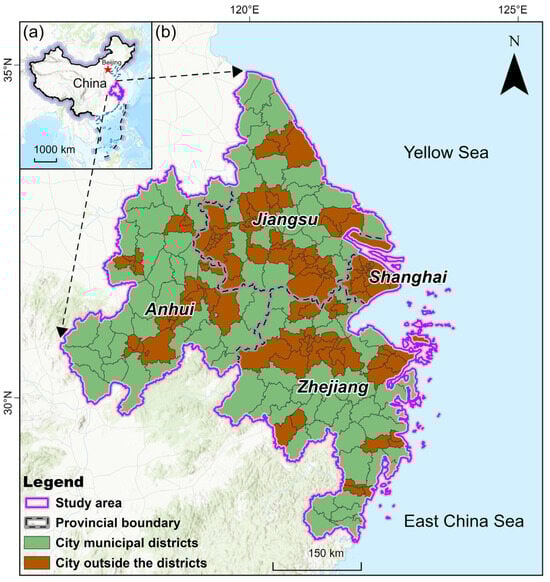 The study area, the Yangtze River Delta Urban Agglomeration (YRDUA), spans 214 county-level administrative units, including both municipal districts and those outside the districts, across 27 central cities in Shanghai, Jiangsu, Zhejiang, and Anhui. The two kinds of districts were distinguished based on the administrative type of the county-level units according to the government. Municipal districts refer to county-level administrative units that are directly governed by the municipal-level administrative authority, and outside districts denote all other county-level administrative units within the study area except municipal districts. Specifically, it comprises 16 counties in Shanghai, 68 in Jiangsu, 75 in Zhejiang, and 55 in Anhui, respectively (Figure 1). The study area covers approximately 222,400 km2, with 114 municipal districts accounting for 35.22% of this area (brown in Figure 1b). Although it represents only 2.1% of China’s total land area, the YRDUA is a significant economic hub, contributing about a quarter of the nation’s total economic output and more than a quarter of its industrial added value. The economic vitality comes with high carbon emission intensity and the complex pressure of rapid urbanization on the ecosystem.