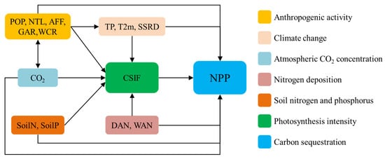 A total of 14 potential driving factors were selected to explore the driving mechanisms behind CS changes in urbanized areas. These encompass a range of factors including anthropogenic activities, climatic change, atmospheric CO2 concentration, nitrogen deposition, soil nutrient cycles, and vegetation photosynthesis. The use of a multi-faceted data approach aims to elucidate the complex interplay between healthy vegetation growth and the myriad factors influencing CS. These 14 indicators in six categories are described below, and the data sources used in this study are detailed in Table 1.