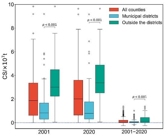 Box plots of CS in all counties, municipal districts, and cities outside the districts in the YRDUA. The values for the years 2001 and 2020 represent the mean CS for each district, while the values for the period 2001–2020 represent the change in CS for each district.