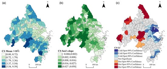 CS spatial distribution characteristics in YRDUA from 2001 to 2020: (a) mean CS; (b) Sen’s slope of CS; (c) hot spot analysis (Getis-Ord Gi*).