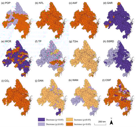 Sen’s slope and significance level of CS driving factors in the YRDUA from 2001 to 2020. The abbreviated characters in (a–l) have the same meaning as in Figure 2. Significant trends indicate p < 0.05. White color means no data in this county.