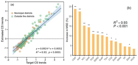 Scatterplot of GWR-RF model fit and importance ranking of drivers for changes in CS from 2001 to 2020 in the YRDUA: (a) scatterplot, with city districts and urban areas outside city districts marked in different colors, and the blue shadow represents the confidence interval of the linear fitting; (b) importance ranking of drivers, where the significance levels are as follows: * denotes p < 0.05 and ** denotes p < 0.01, respectively.