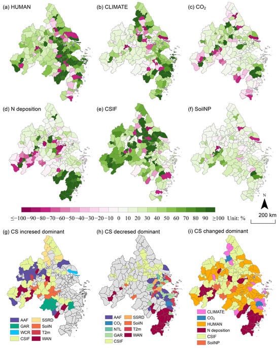 Spatial distribution of contribution of CS driving factors at county scale in YRDUA. (a–f) represent driving contribution of HUMAN, CLIMATE, CO2, N deposition, CSIF, and CO2 to CS changes, respectively. HUMAN is sum of POP, NTL, AAF, GAR, and WCR; CLIMATE is sum of T2m, SSRD, and TP; N deposition is sum of DAN and WAN; SoilNP is sum of SoilN and SoilP. All units are in %. (g,h), respectively, represent dominant driving factors in municipal and outside districts. (i) represents class of dominant driving factors in study area. Gray color means no data in this county.