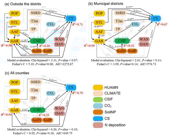 SEM causal path modeling driven by changes in CS in the YRDUA from 2001 to 2020. The results are obtained by verifying the model assumed in Figure 2. (a) Outside the districts. (b) Municipal districts. (c) All counties. The black arrow indicates that the predictive factor has a significant impact on the response variable (* p < 0.05, ** p < 0.01, *** p < 0.001), while the dashed line indicates no significant impact. The direction of the arrow represents the direction of causal action, and the number on the arrow is the standardized path coefficient β. A larger β implies a stronger driving influence.